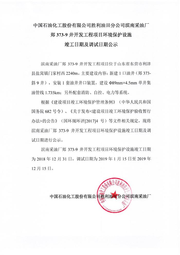 中國石油化工股份有限公司勝利油田分公司濱南采油廠鄭373-9井開發(fā)工程項目環(huán)境保護(hù)設(shè)施竣工日期及調(diào)試日期公示