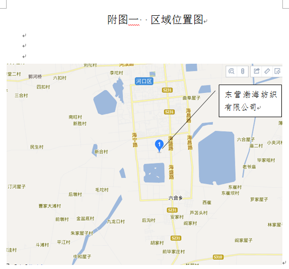 東營渤海紡織有限公司位于東營市河口區(qū)海河路以西、陽河路以北,占地面積100畝。廠區(qū)所在地南面為陽河路,距離為20m,廠區(qū)西面為東營市布萊特石油裝備有限公司、東營市三鎮(zhèn)服飾有限公司,距離大約15m;東面為海河路,距離大約為20m,海河路以東為金色河口(集團)新型材料有限責任公司、預(yù)制砂漿廠、東營建友新型材料有限公司、匯昶飼料廠和東營市廣和化工有限公司),距離為80m;北面為金河路,距離大約為20m,金河路以北為東營市大中南實業(yè)有限公司,距離大約為120m。 |