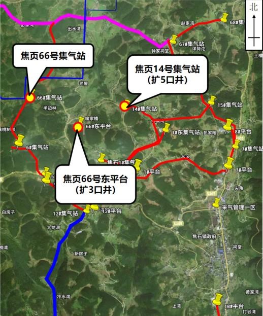 焦頁14號平臺新建井口距離東側最近的散居民房約258m,與東側架空電力線路約115m,與南側架空電力線路約81m,與西南側公路約55m。焦頁66號東平臺新建井口距離東北側最近的散居民房約99m,與西北側散居民房約114m,與北側公路約96m,與南側架空電力線路約80m。 |