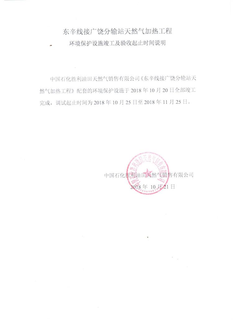 東辛線接廣饒分輸站天然氣加熱工程環(huán)境保護設施竣工及驗收起止時間說明