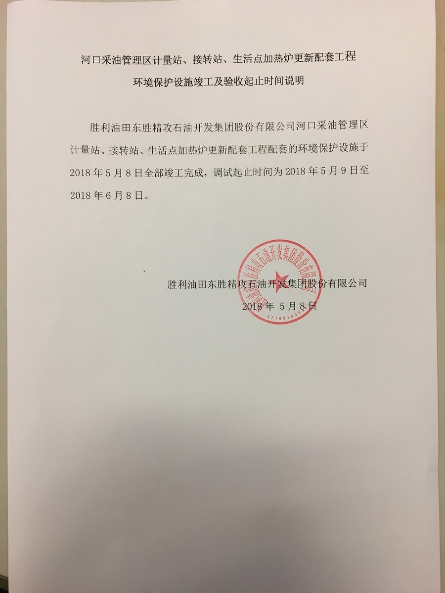 河口采油管理區(qū)計量站、接轉(zhuǎn)站、生活點加熱爐更新配套工程環(huán)境保護(hù)設(shè)施竣工及驗收起止時間說明
