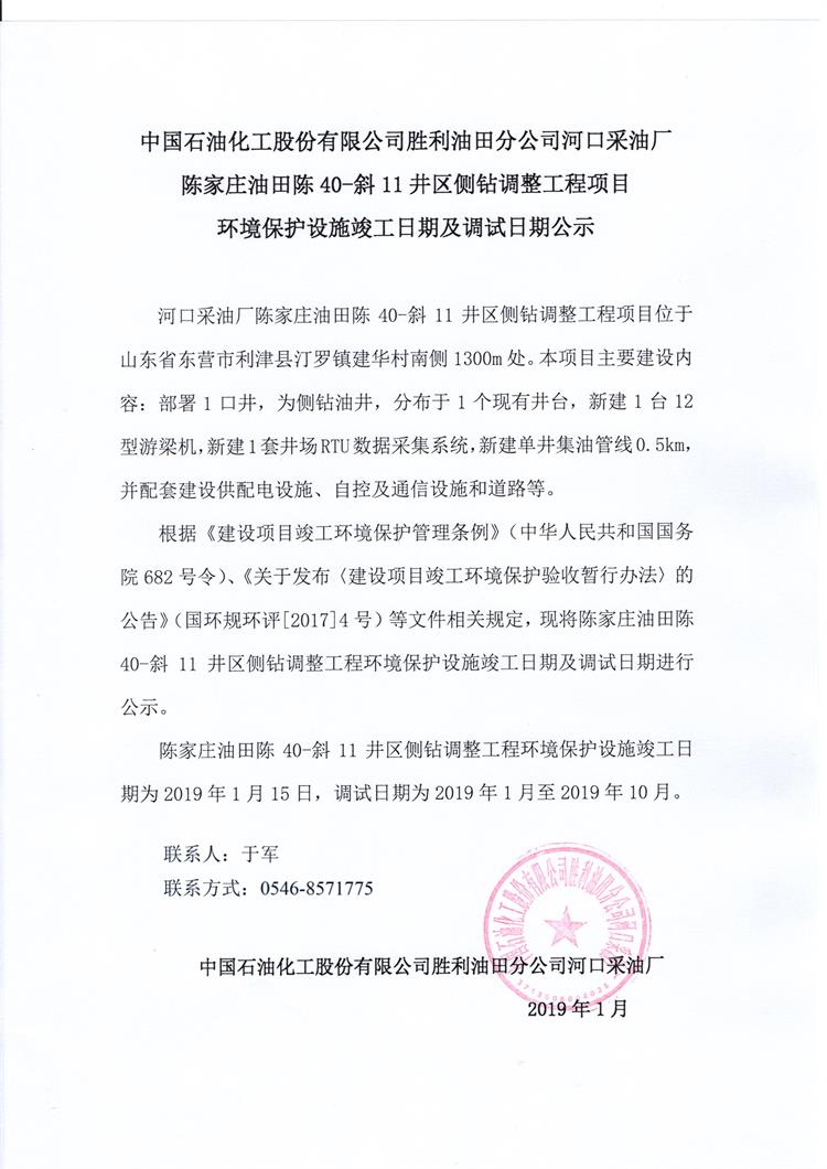 中國石油化工股份有限公司勝利油田分公司河口采油廠陳家莊油田陳40-斜11井區(qū)側(cè)鉆調(diào)整工程項目 環(huán)境保護設(shè)施竣工日期及調(diào)試日期公示